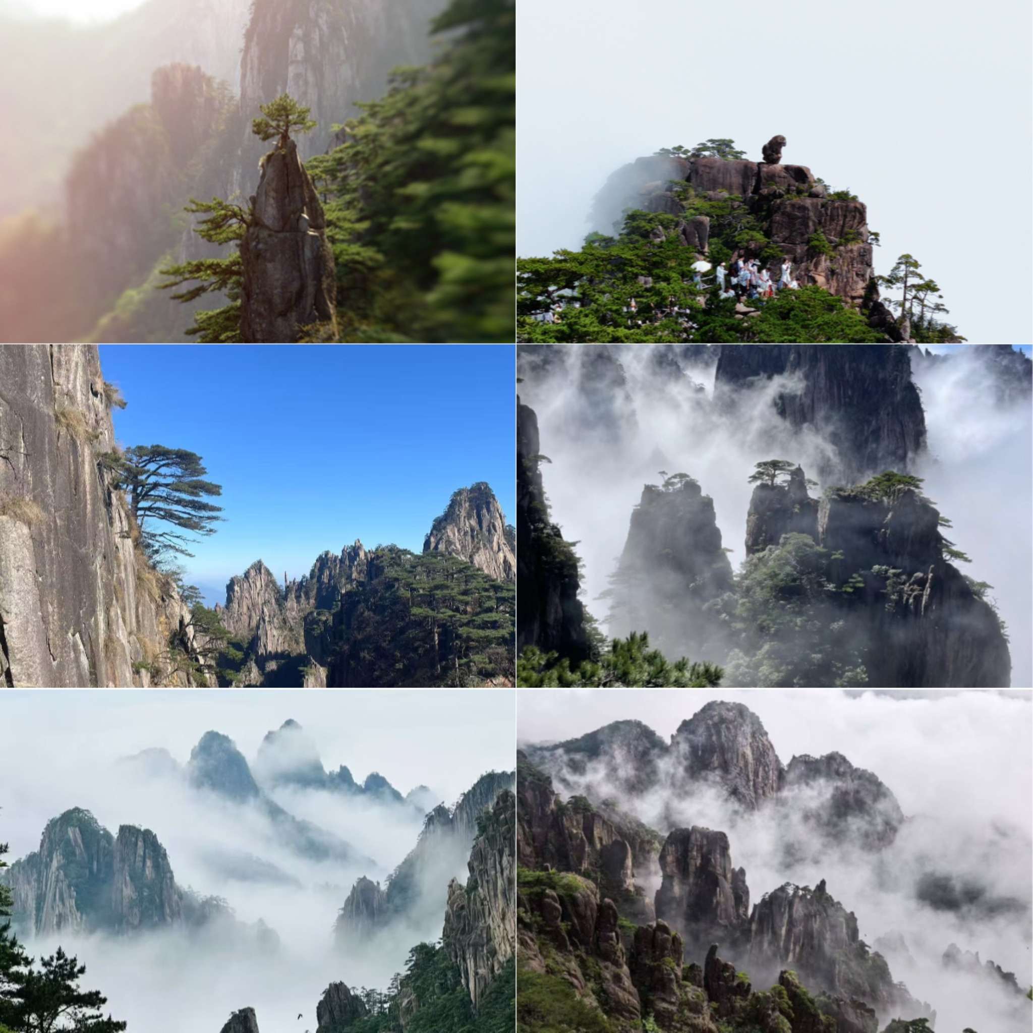 始信峰、黑虎松、狮子峰、猴子观海、清凉台、梦笔生花、光明顶、飞来石、西海景区、迎客松等。